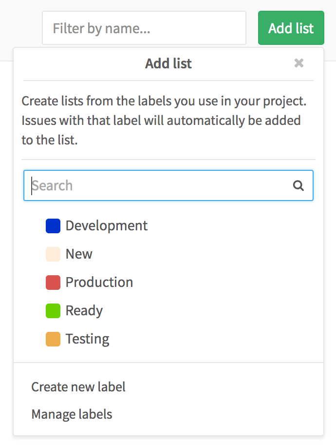 | List | Each label that exists in the issue tracker can have its own dedicated list. Every list is named after the label it is based on and is represented by a column which contains all the issues associated with that label. You can think of a list like the results you get when you filter the issues by a label in your issue tracker. |
